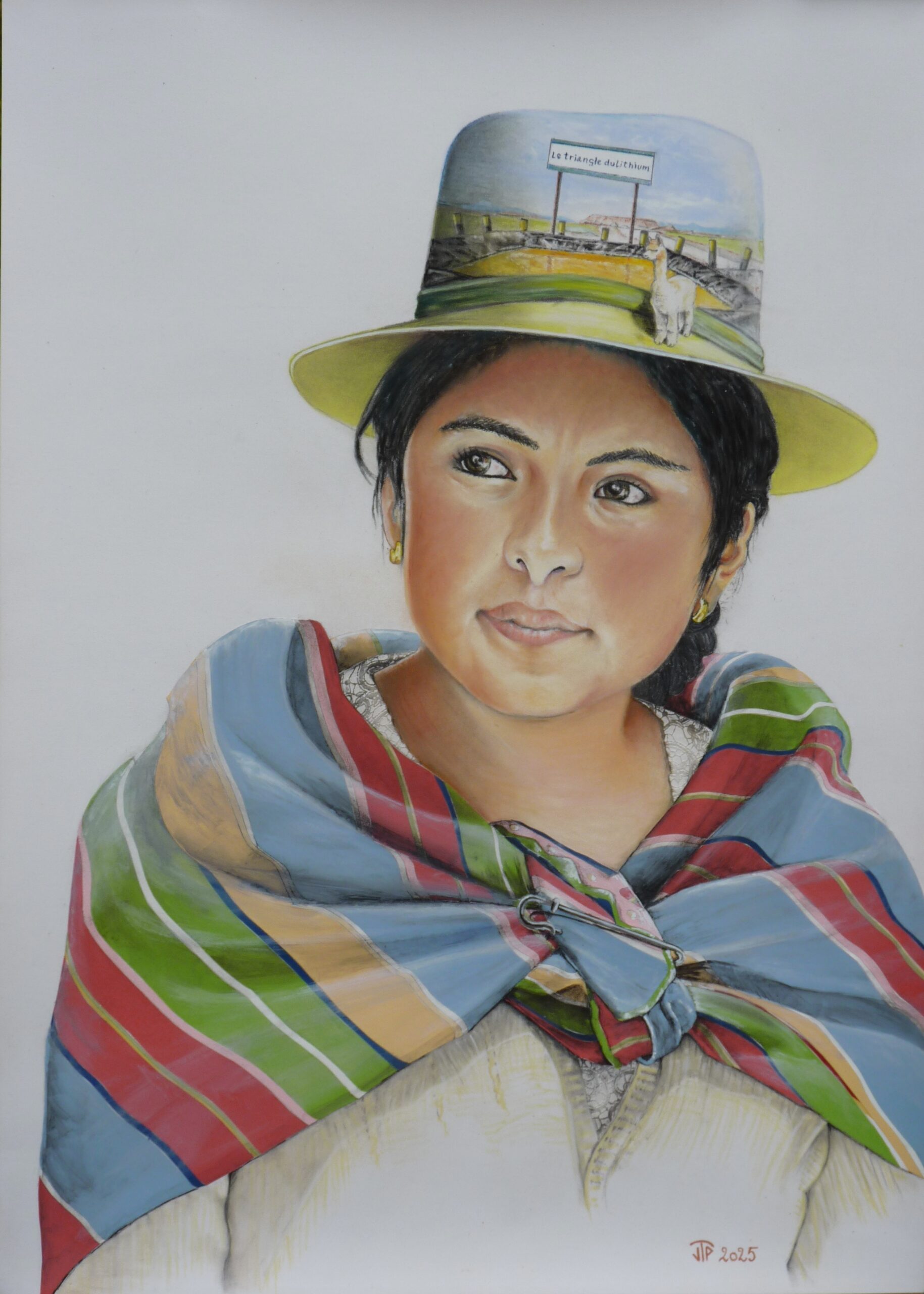 Pastel sec pour le visage, le chapeau et le gilet, collage pour le poncho avec cadre vitré