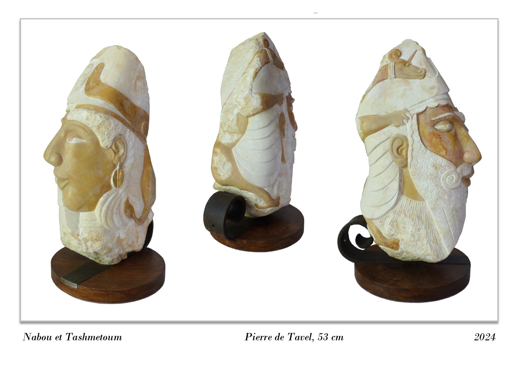Sculpture en Pierre de tavel socle Noyer, volute fer forgé. Sculpture réalisée en 2024
